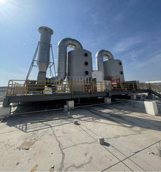 4、废气处理工艺:喷淋预处理+多相催化氧化塔,处理过程:车间内异味有机废气经过集中收集后,通过管道引至车间天面,通过风机的负压抽吸作用,集中收集的有机废气首先进入到气旋碱液喷淋塔进行预处理(主要去除各酸性物质、易溶于水的物质以及粉尘),然后进入氧化喷淋塔进行预氧化分解处理,净化后高空达标排放。